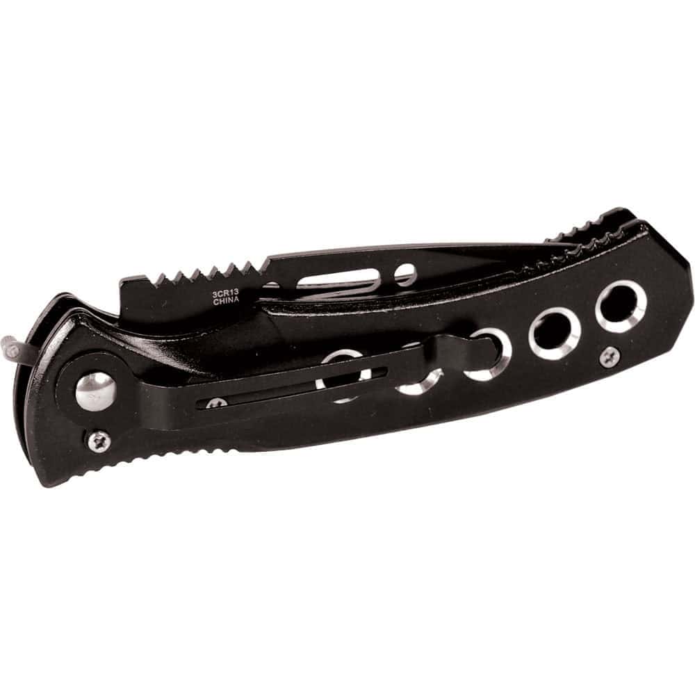 Overall length is 8 inches when open. The handle and blade are both black stainless steel, giving it a clean, low-profile appearance. Weight is 0.4 lbs. This is a utility knife — it’s built to be used, not displayed. Check your local knife laws before purchasing, as automatic knife regulations vary by location.